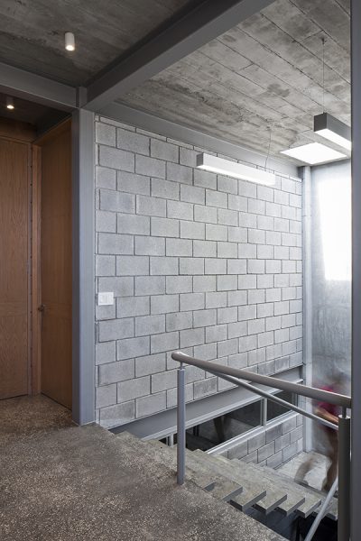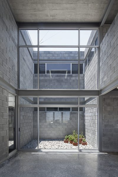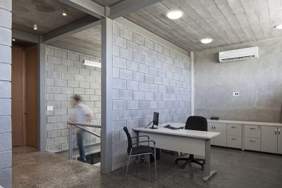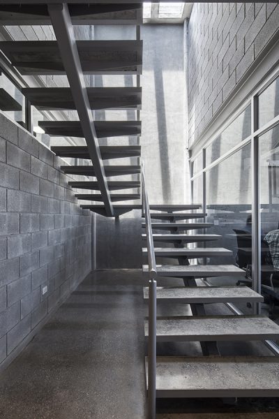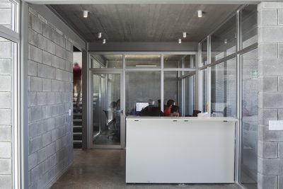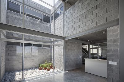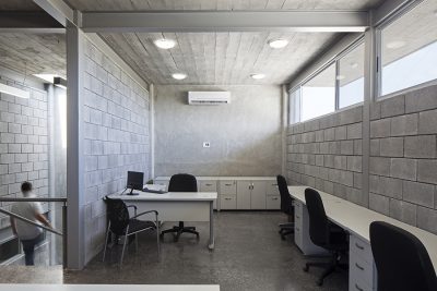 Cerrada hacia el exterior, un pórtico de acceso brinda una escala que recibe al peatón y protege la fachada del sol. Un patio central inunda el área de oficinas de luz y ventilación dejando todas las áreas iluminadas naturalmente. En la segunda planta, una oficina principal se abre hacia el área de producción. El resto del programa: un laboratorio y espacio de trabajo compartido rodean al patio central.